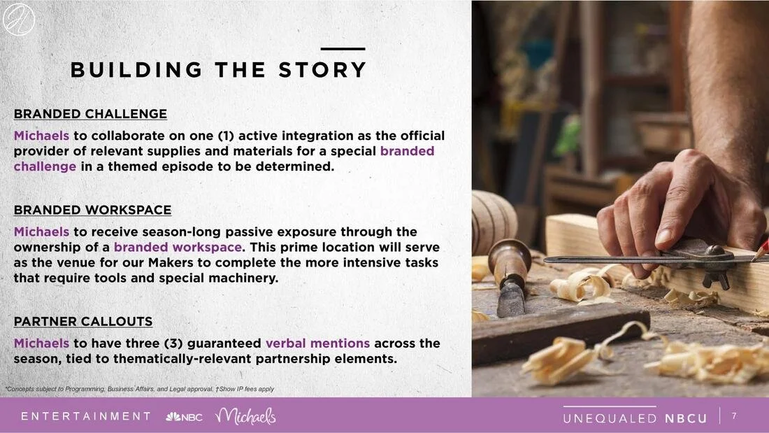 THE EFFECT: True to the singular nature of every craft, a proposal was constructed with every facet – from language to design – handmade specifically for Michaels. On a patchwork and eye-catching canvas embodying the lighthearted sensibility of the show, a mix of color and imagination painted a potential partnership that would see the client splashed across every corner of the picture. Encompassing scalable elements including physical production assets, in-show callouts, on-air + digital exclusive content, companion series and off-channel opportunities, this tailored presentation remained budget-flexible while threading Michaels meticulously into the Making It tapestry.